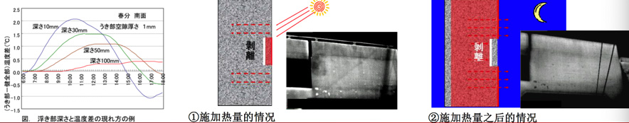 ① 白天、針對水泥外部施加熱量的話,與健全部位相比較的剝離部位熱容量小、容易更快發(fā)熱。