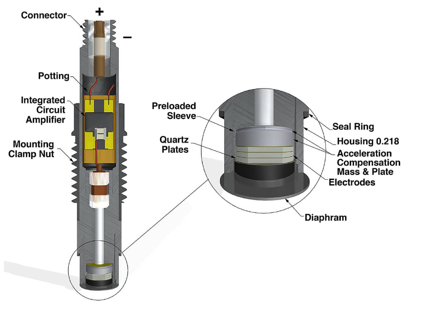 大多數(shù)PCB?壓電型壓力傳感器中的石英晶體在堅(jiān)固的傳感器外殼內(nèi)采用壓縮式預(yù)緊,電氣石晶體采用無約束形式。這些設(shè)計(jì)使傳感器具有微秒級(jí)響應(yīng)時(shí)間和幾百赫茲的固有頻率,能夠*小化過沖或者振鈴現(xiàn)象發(fā)生的可能性。
